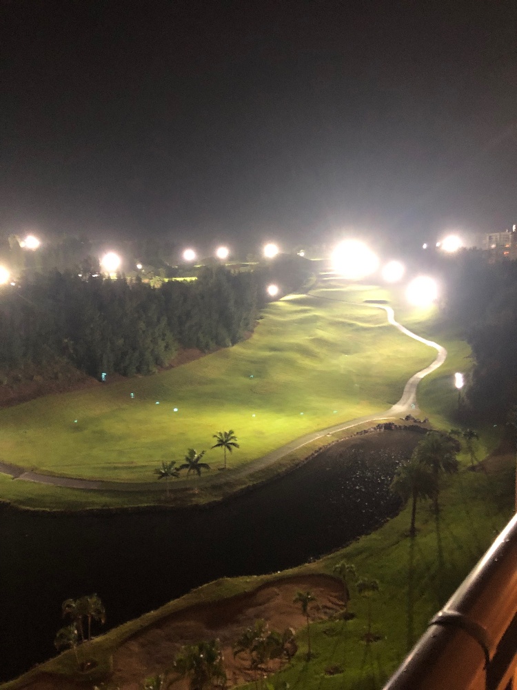 窓の外にはナイター照明に照らされたフェアウェイが広がり、南国らしいヤシの木と水辺がリラックスムードを演出していました。
