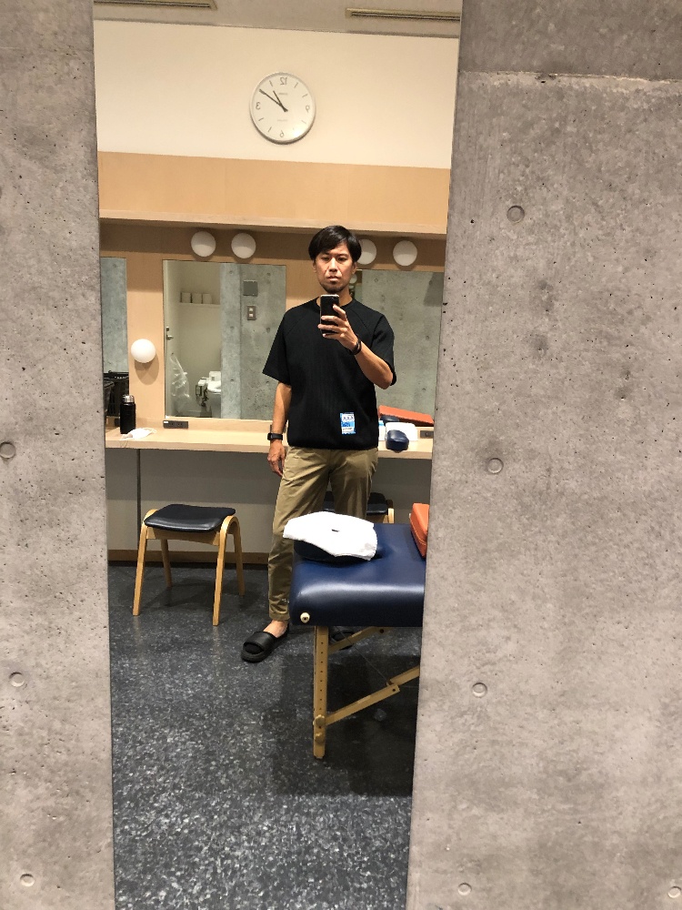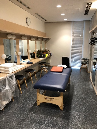 楽屋は広く清潔で、照明が明るく施術しやすい空間。身体の疲れをしっかりケアできるよう、落ち着いた雰囲気作りを心がけました。